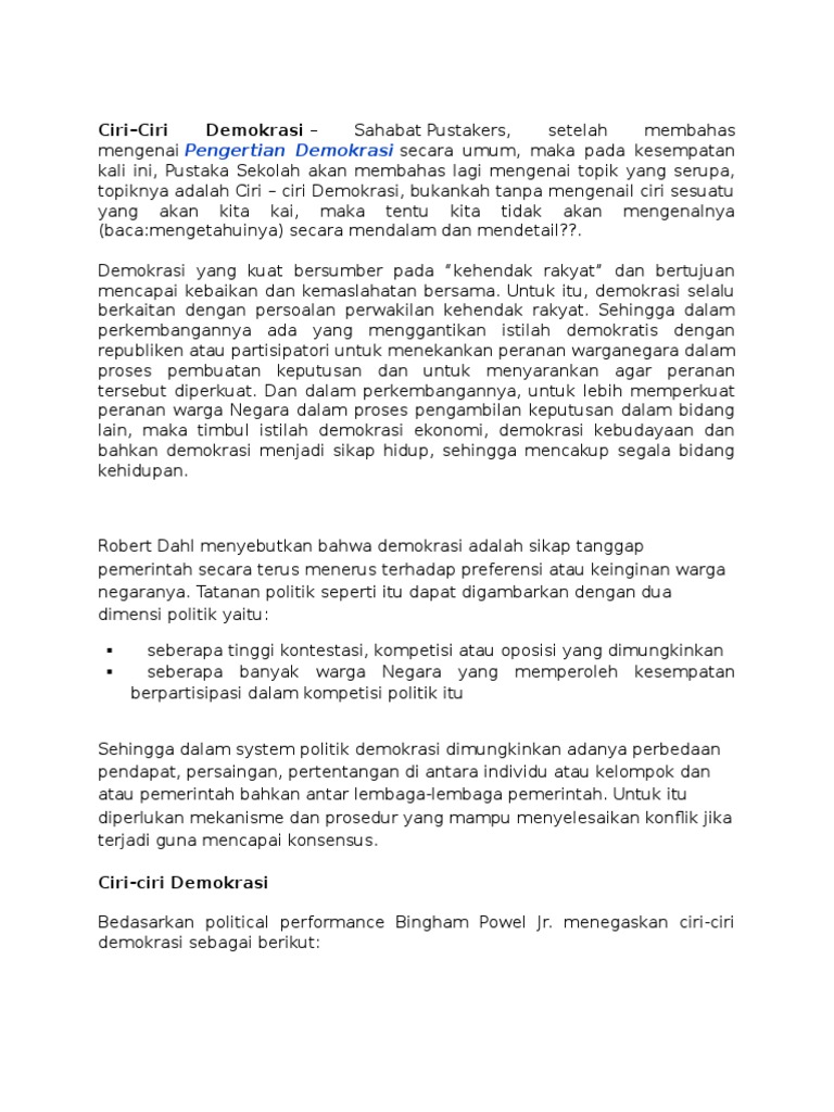 Mulai dari pengertian, ciri ciri, kelebihan, kekurangan, latar belakang, penyimpangan demokrasi terpimpin. Kata ini terbentuk dari kata demos yang berarti rakyat. Demokrasi terpimpin ini adalah salah satu manajemen pemerintahan di indonesia yang memiliki landasan otokrasi. Apa itu arti definisi ciri ciri macam macam demokrasi di indonesia sejarah prinsip konsep bentuk contoh negara demokratis. Berikut ini adalah ciri ciri ekonomi islam yang ada dinegeri jiran malaysia; Singkatnya, rakyat diprioritaskan sejahtera ketika menjadi bagian negara. Ada beberapa ciri fundamental yang harus ada pada sebuah negara yang mengaku sebagai negara dengan. Adanya keterlibatan warga negara (rakyat) dalam pengambilan keputusan politik. Pada sistem pemerintahan demokrasi memberikan kesempatan penuh kepada warganya untuk berpartisipasi. Semua warganegara lelaki dewasa menjadi ahli dewan perhimpunan.manakala;demokrasi di malaysia berbentuk penyertaan tidak langsug juga rakyat diwakili oleh wakil dalam dewan rakyat dan wakil rakyat dipilih melalui pilihan raya. Demokrasi di athens berbentuk penyertaan langsung. Demonstrasi merupakan bentuk demokrasi via harianterbit.com. Di jepang, kulit kayu, akar penyangga.