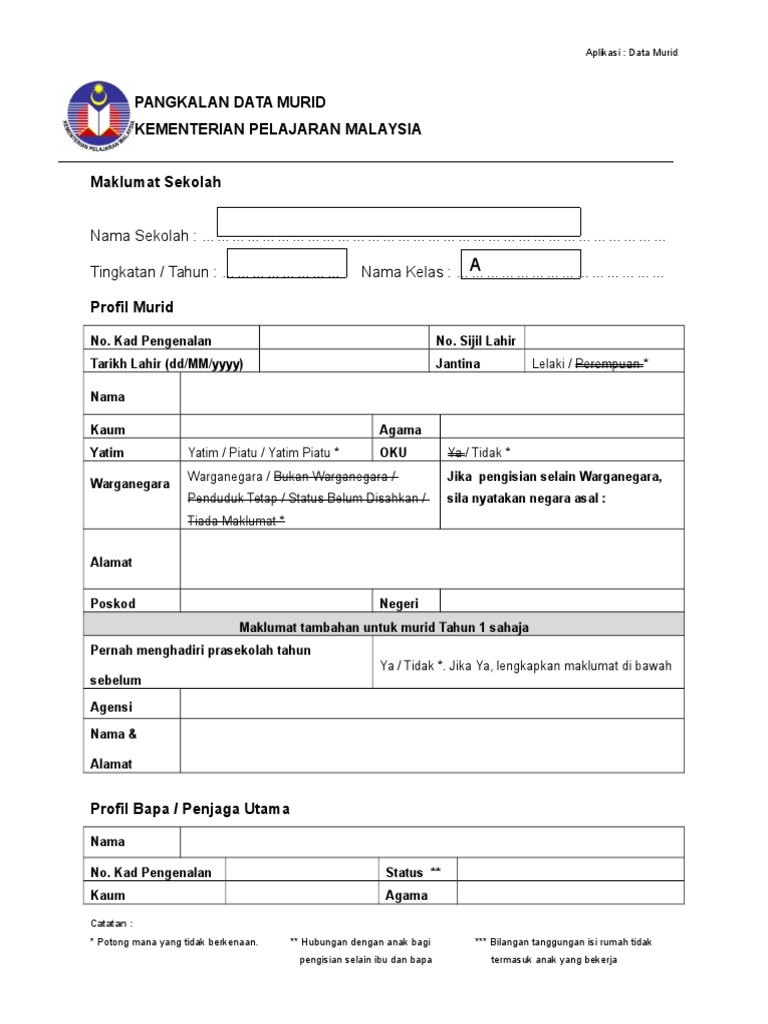 Apdm atau aplikasi pangkalan data murid merupakan satu sistem pangkalan data murid di sekolah kementerian pendidikan malaysia. Taklimat portal pangkalan data murid— presentation transcript 3 dapatan kajian dan cadangan penambahbaikan inisiatif ict kpm 2011 1.3: A) membuat pendaftaran kelas baru bagi tahun 1, tingkatan 1 dan peralihan b) mendaftarkan murid ke dalam kelas yang ditetapkan melalui senarai data murid dalam tetapan tahun 1, tingkatan 1 dan. Guru akan merekod kehadiran setiap murid setiap hari persekolahan. Savesave borang pangkalan data murid kpm kosong for later.